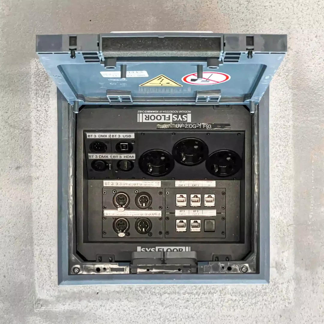 • 4 x Bodentank (Ausstattung: 5x LAN, 4x 3-pol. Audio sym, 2xDMX, 1x HDMI, 1xUSB)