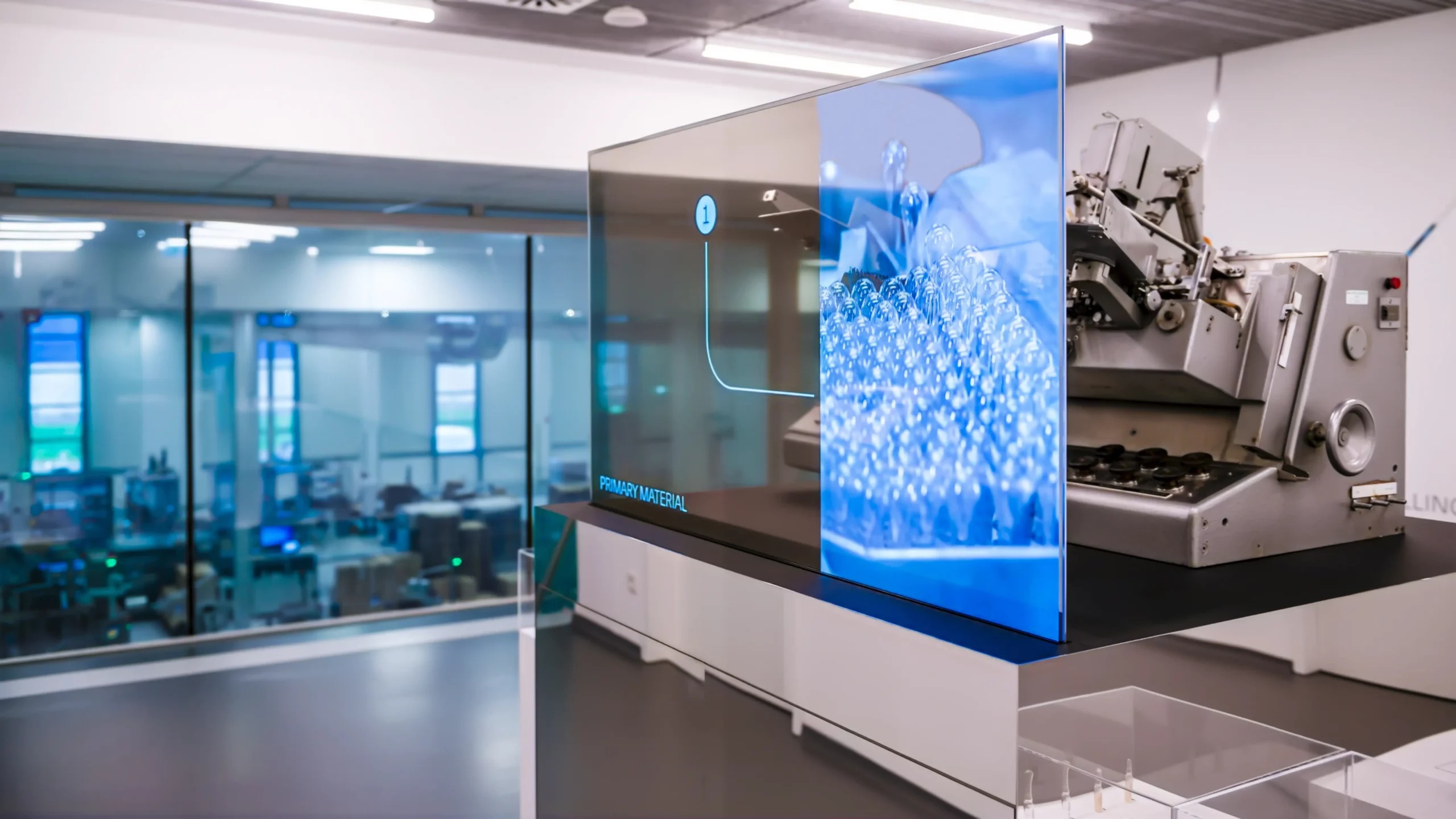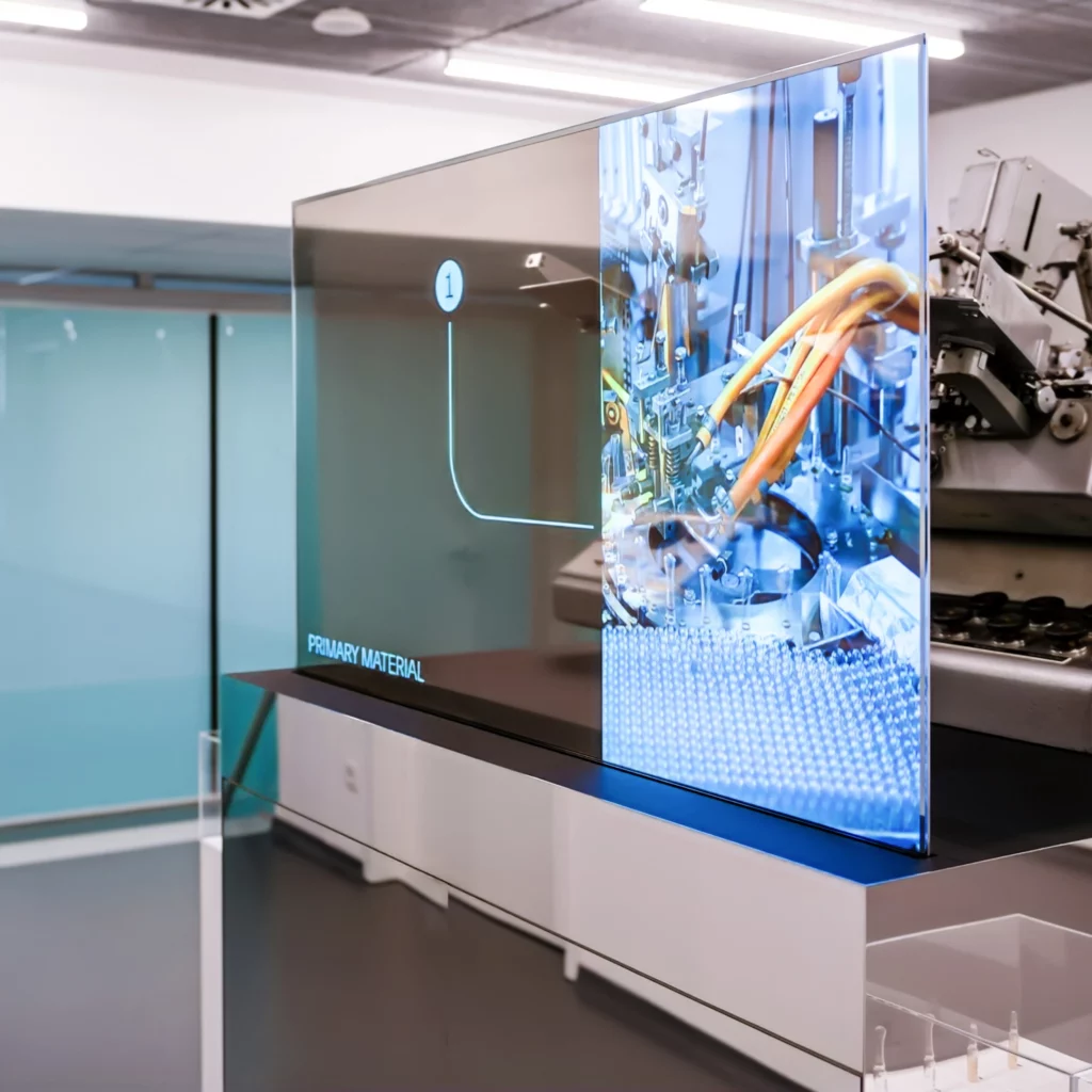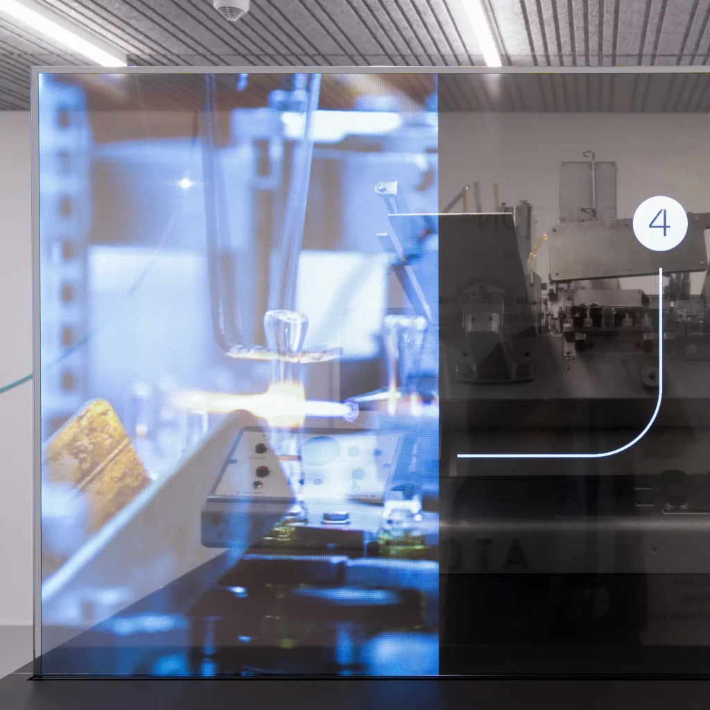 Transparentes Display zur Darstellung der Funktionsweise einer klassischen Ampullenmaschine. Im Hintergrund sieht man eine Glaswand, die mit einer 2 Face Foil beschichtet wurde. Sie ermöglicht auf Knopfdruck den Blick auf den Produktionsbereich.