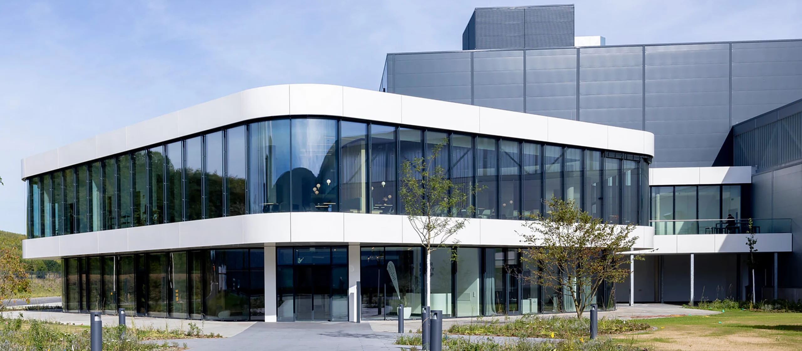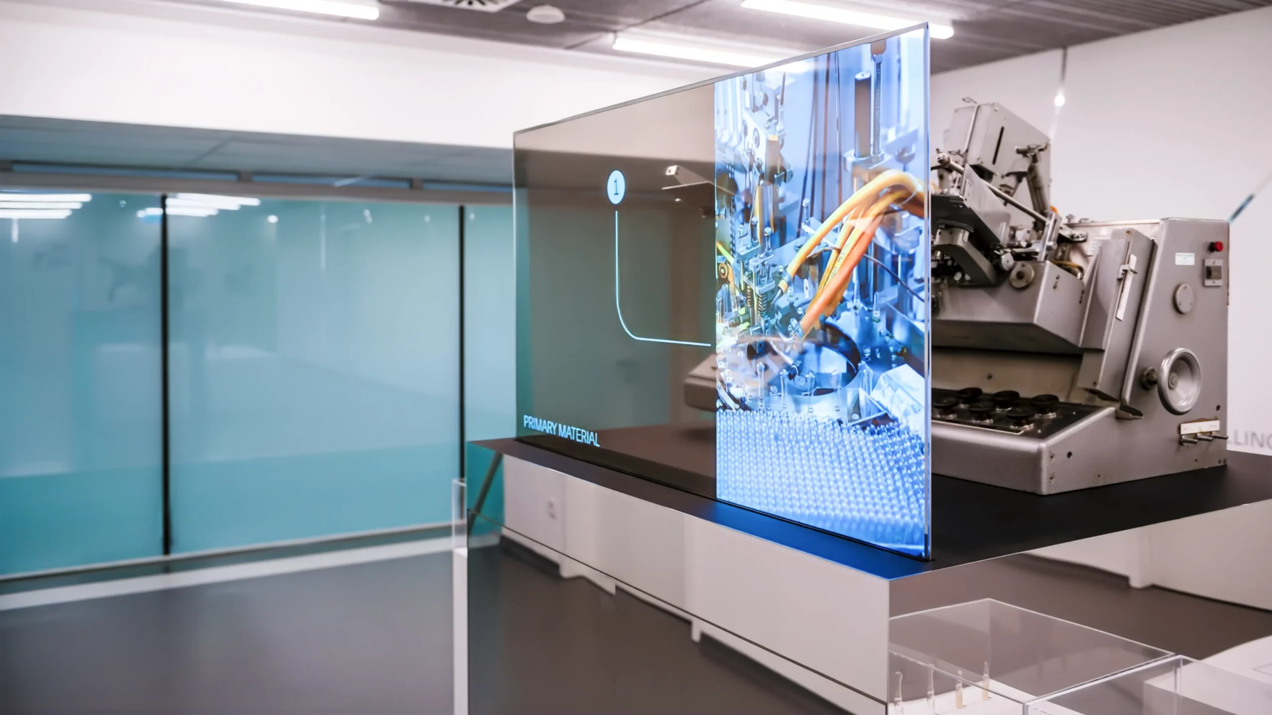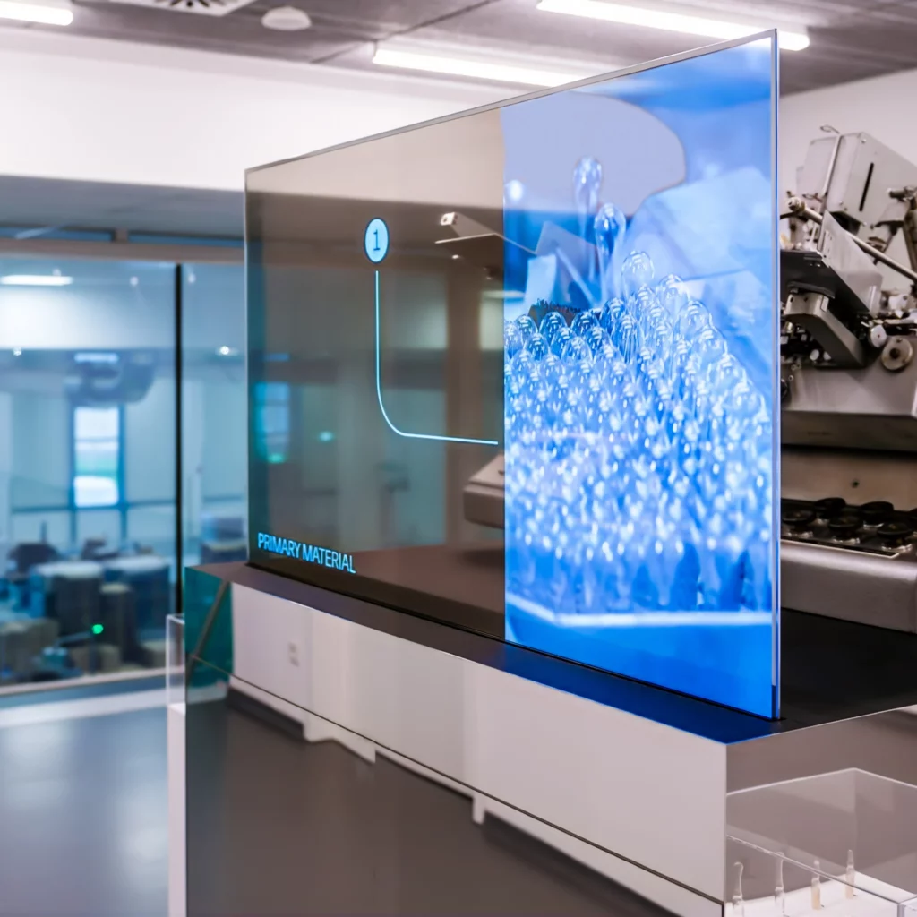 Transparentes Display zur Darstellung der Funktionsweise einer klassischen Ampullenmaschine. Im Hintergrund sieht man eine Glaswand, die mit einer 2 Face Foil beschichtet wurde. Sie ermöglicht auf Knopfdruck den Blick auf den Produktionsbereich.