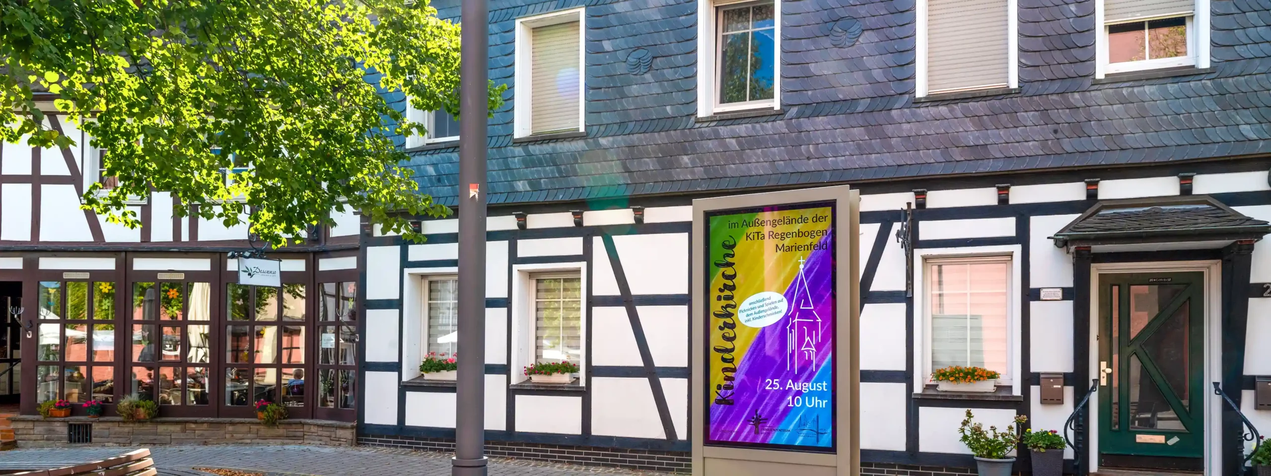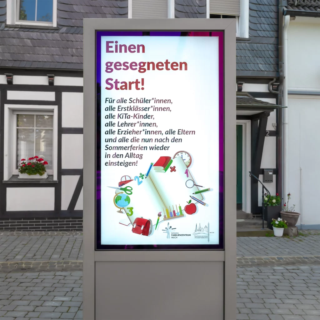 In Much, im Bergischen Land, zeigt sich, wie harmonisch sich eine moderne DOOH-Anwendung in ein klassisches Gebäude-Ensemble einfügen kann.