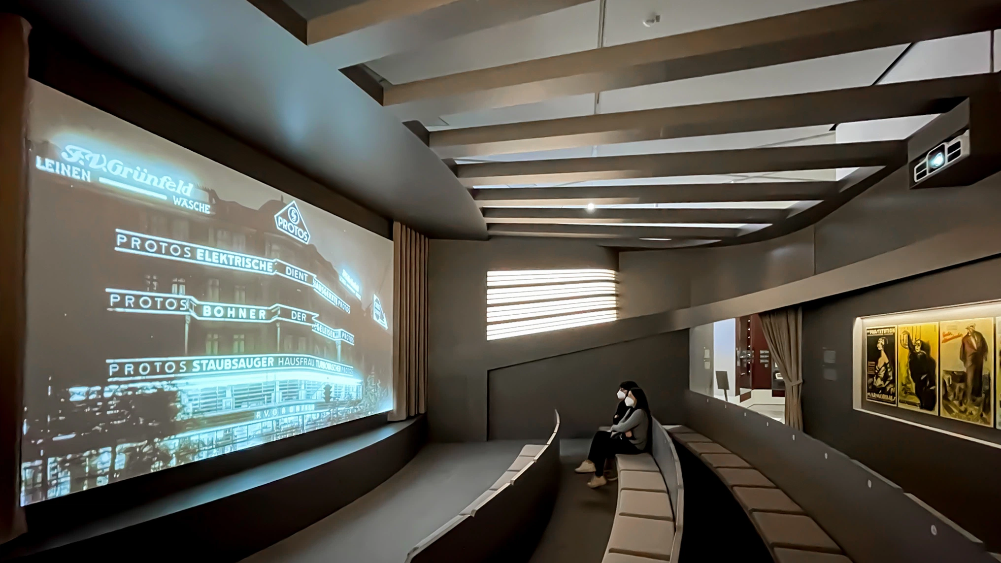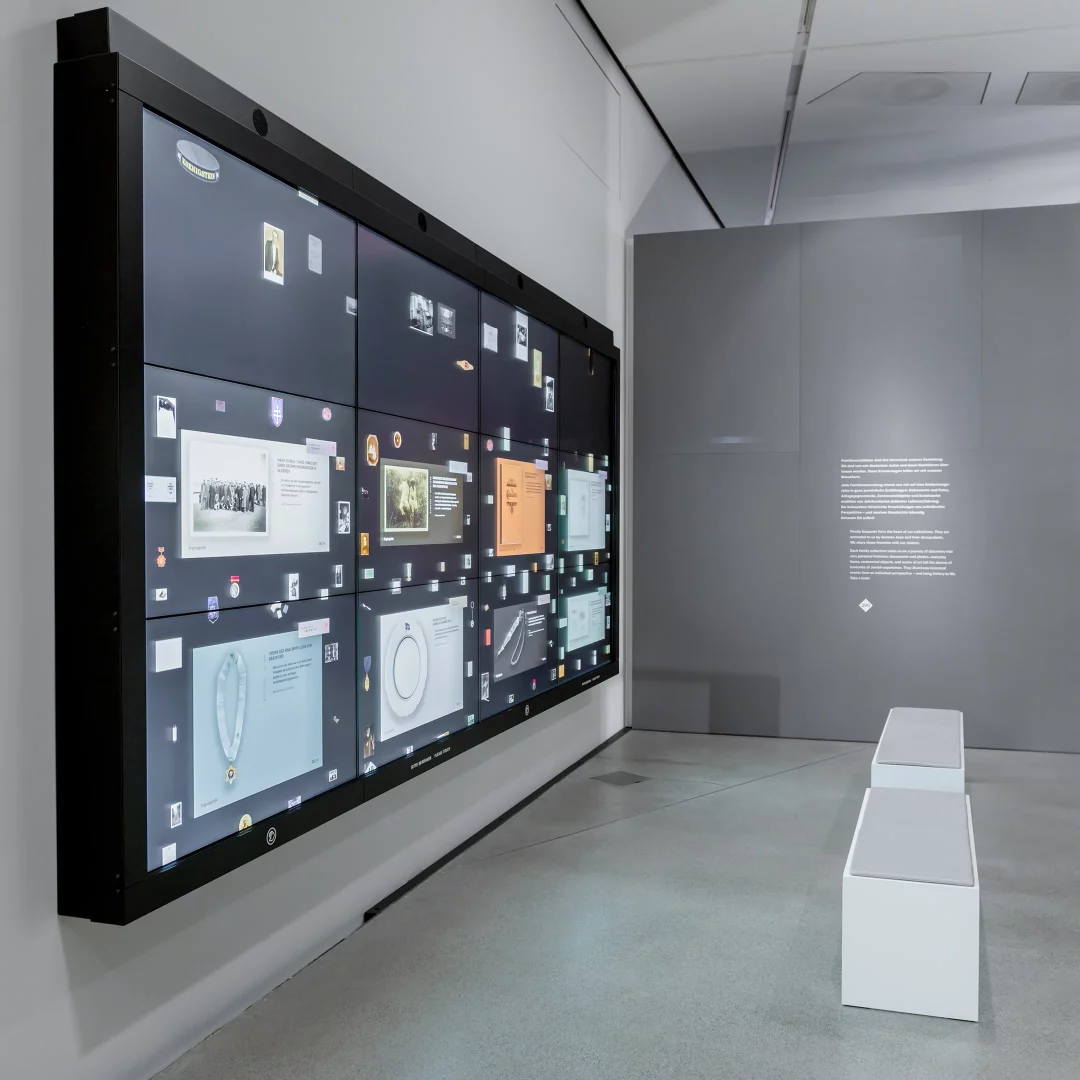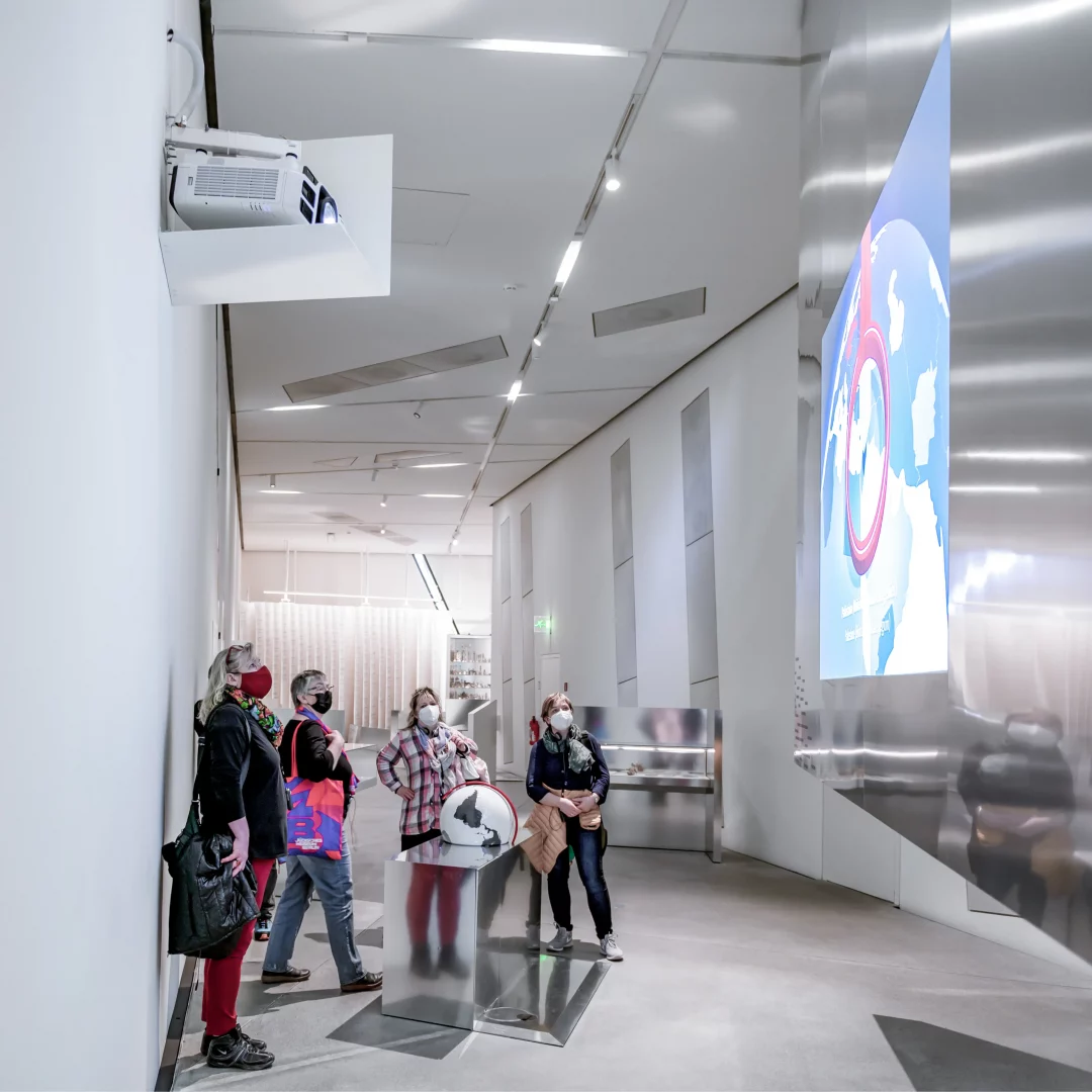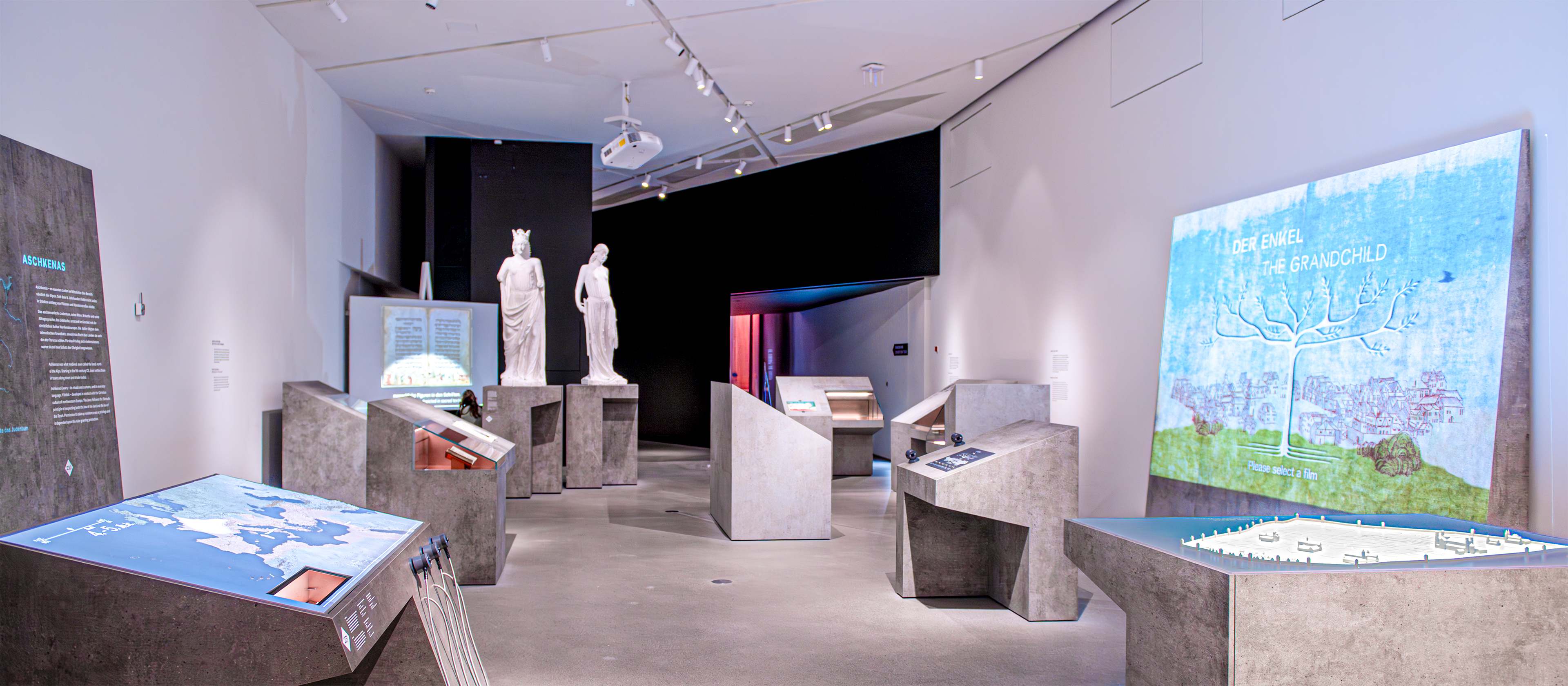 Projektionen über Spiegel aus der Decke auf Tische/Exponate oder Leinwände (teils in Softedge), bebildern eindrucksvoll die Erzählungen. Interaktive Touchdisplays und eine Videosplitwand geben den Besuchern die Möglichkeit aktiv in die einzelnen Themen einzutauchen.