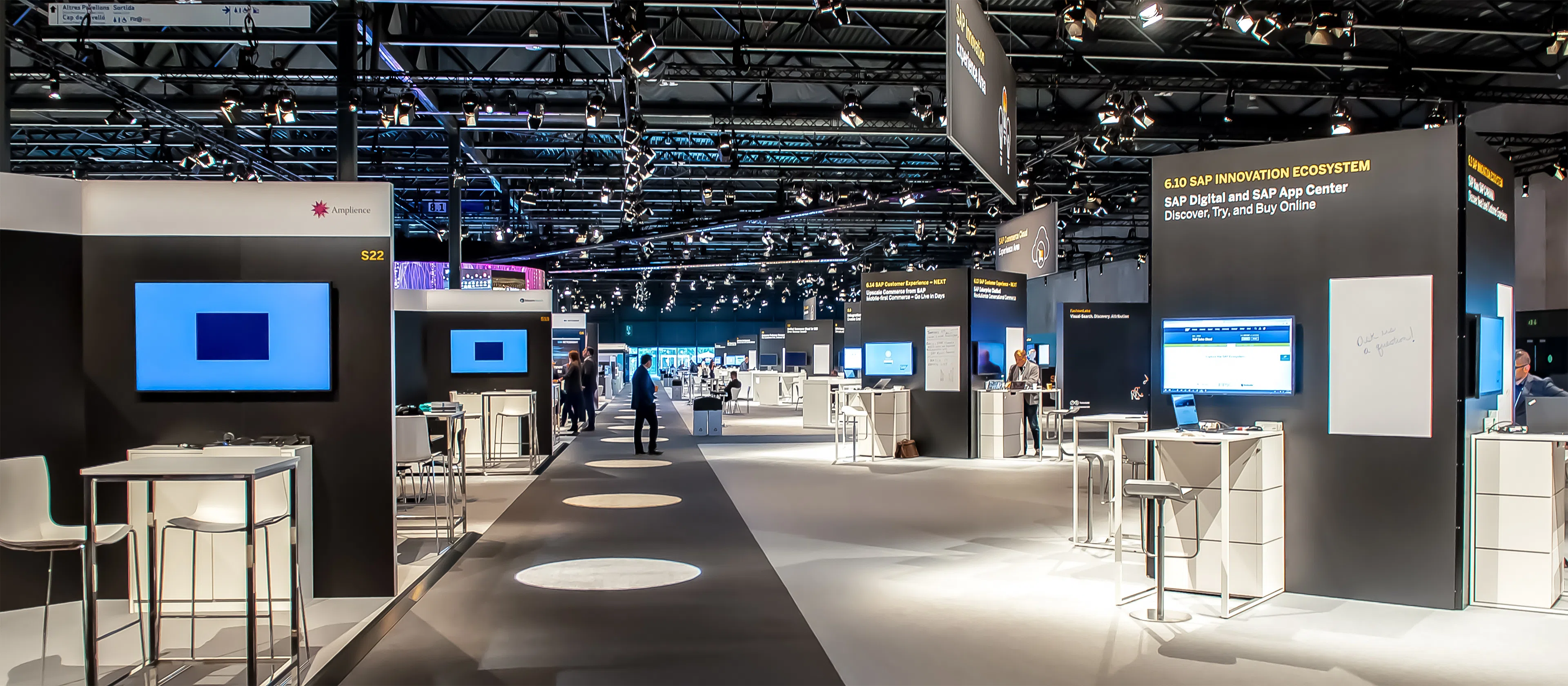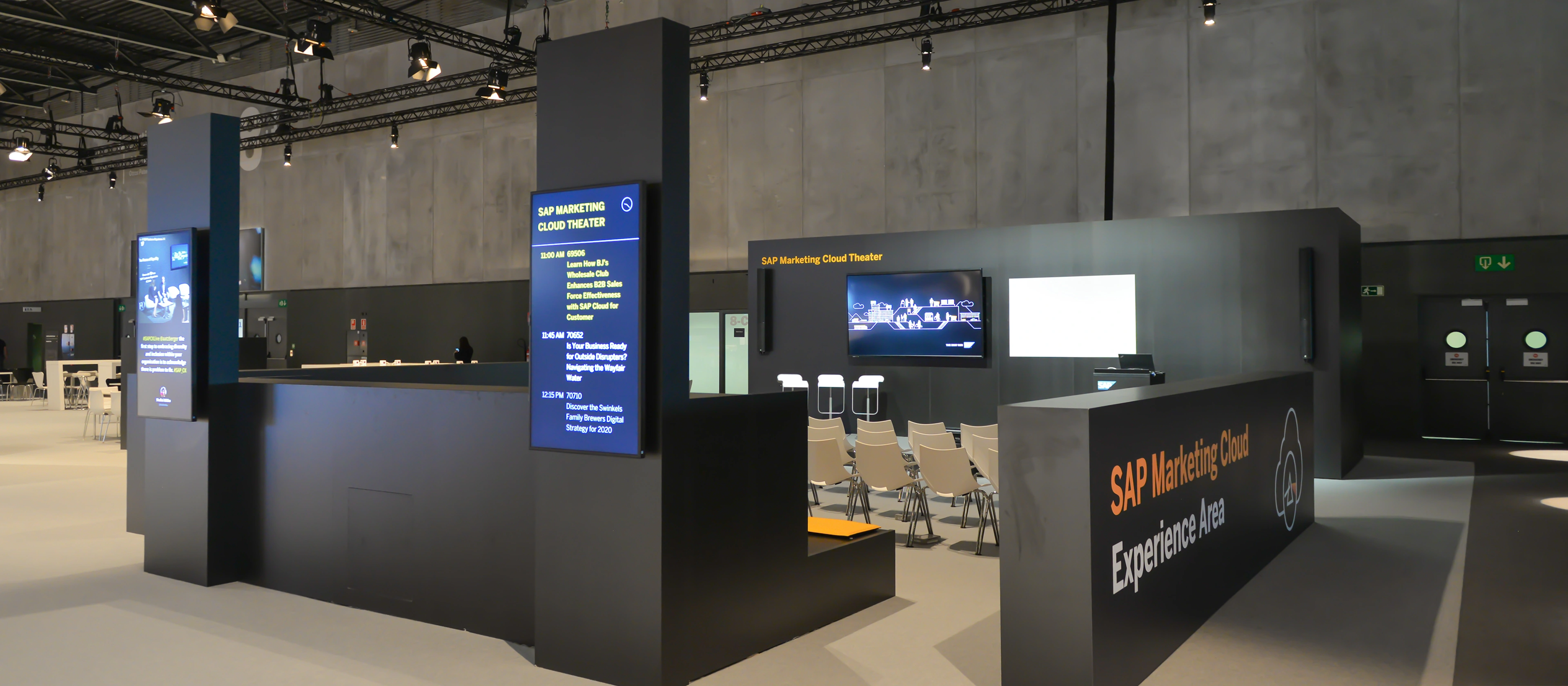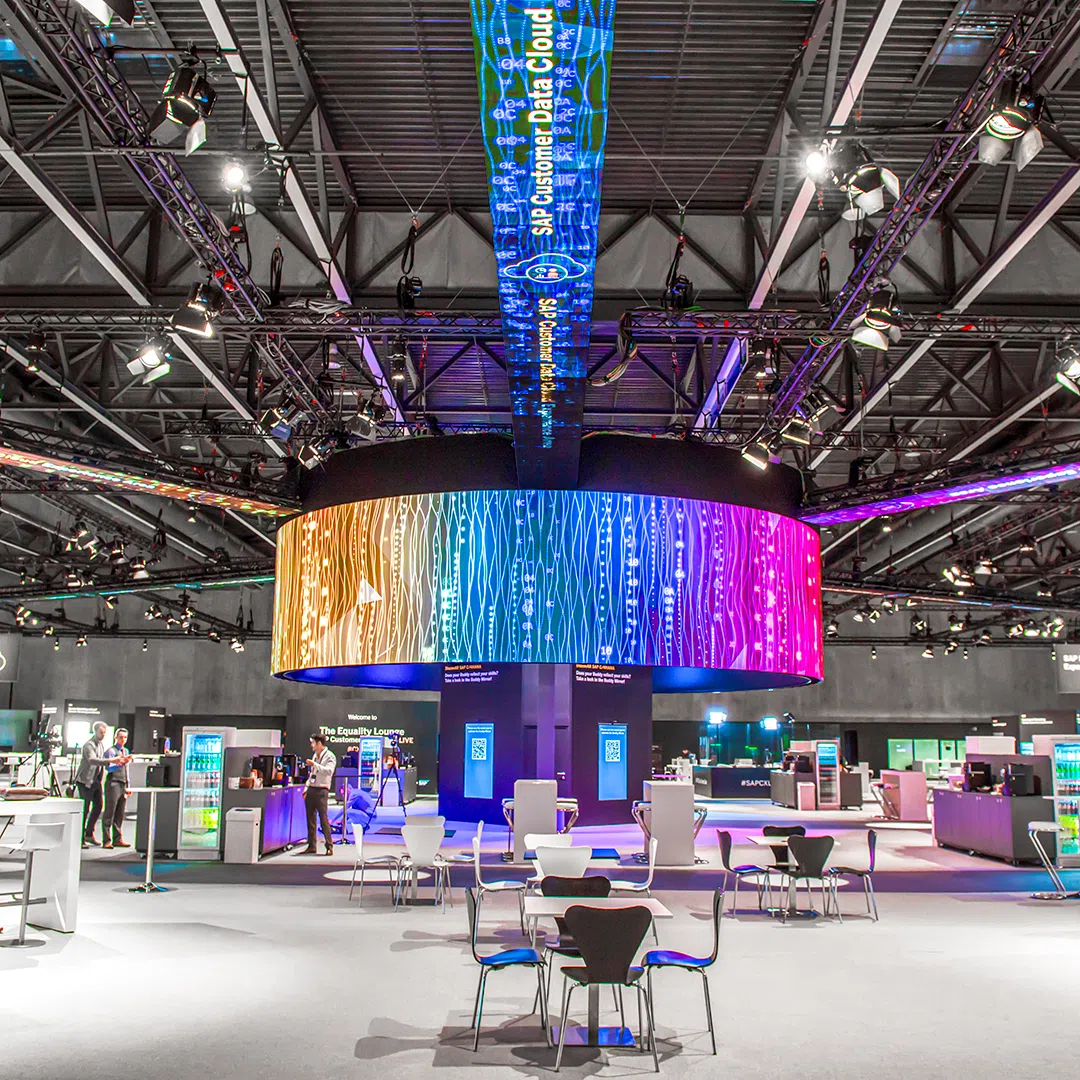Es gab einem offenen Veranstaltungsbereich mit Partnerständen, kleinen Foren , Demo Pods, Live-Theatern, sechs Konferenzräumen und anderen Nebenbereichen. Zentrales Herzstück war eine Deckeninstallation aus LED Modulen. Ferner kamen über 200 Displays, unterschiedliche Projektoren, Leinwände u.v.m. zum Einsatz.