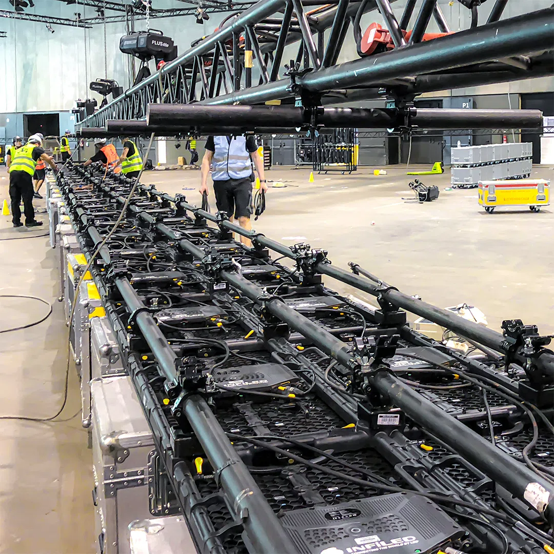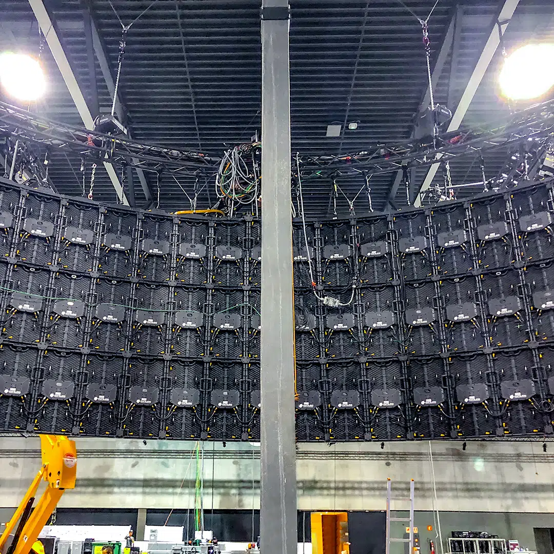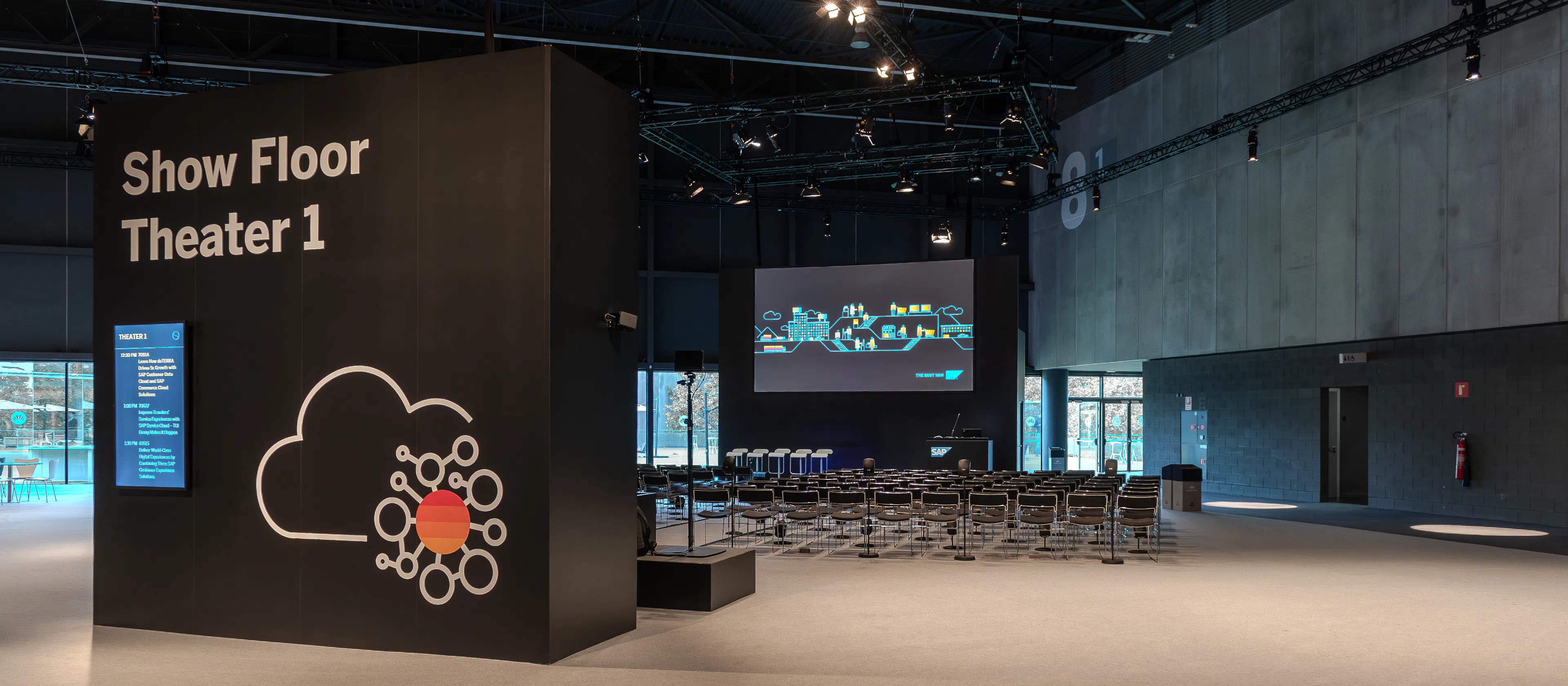Es gab einem offenen Veranstaltungsbereich mit Partnerständen, kleinen Foren , Demo Pods, Live-Theatern, sechs Konferenzräumen und anderen Nebenbereichen. Zentrales Herzstück war eine Deckeninstallation aus LED Modulen. Ferner kamen über 200 Displays, unterschiedliche Projektoren, Leinwände u.v.m. zum Einsatz.
