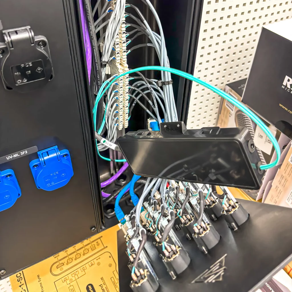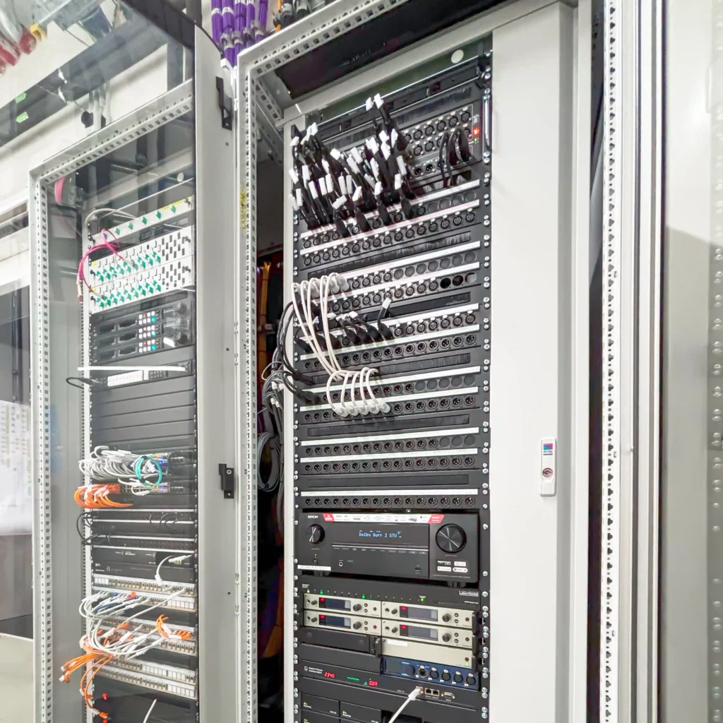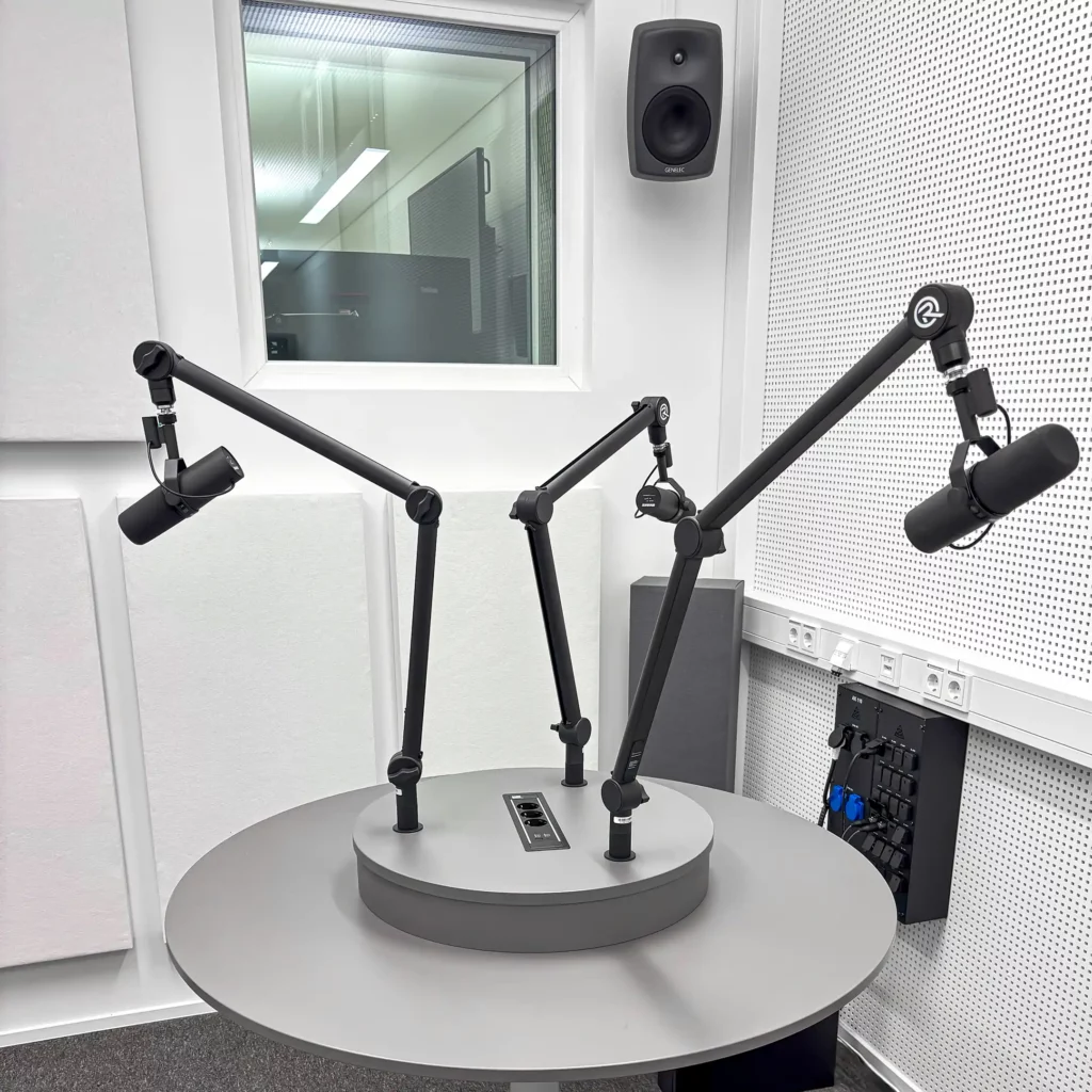 Im Aufnahmestudio erfolgte die Konstruktion und Montage eines flächendeckenden Deckengrids für die Audio-, Video- und Lichttechnik. Das Deckengrid bietet eine stabile Struktur, um Geräte wie Mikrofone, Kameras, Scheinwerfer und andere technische Ausstattungen an der Decke zu montieren.