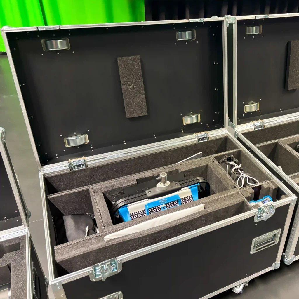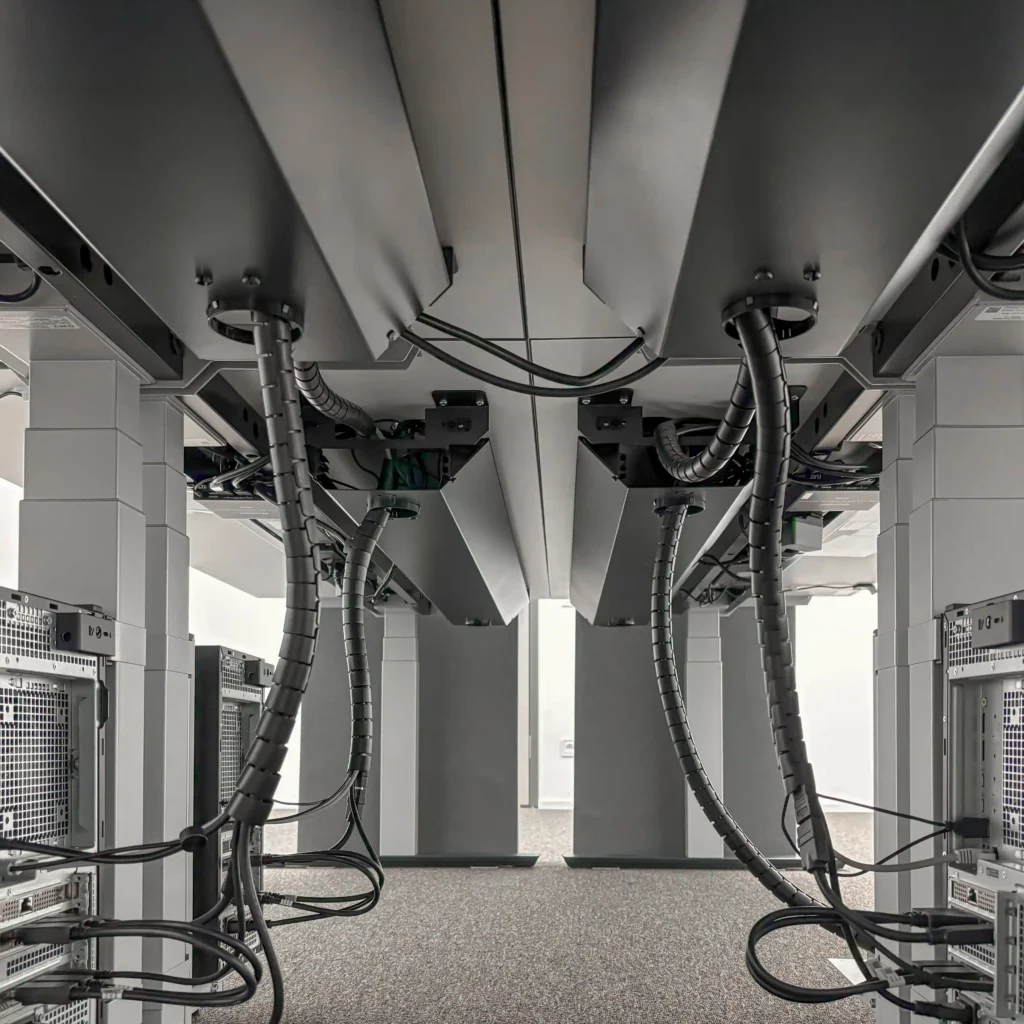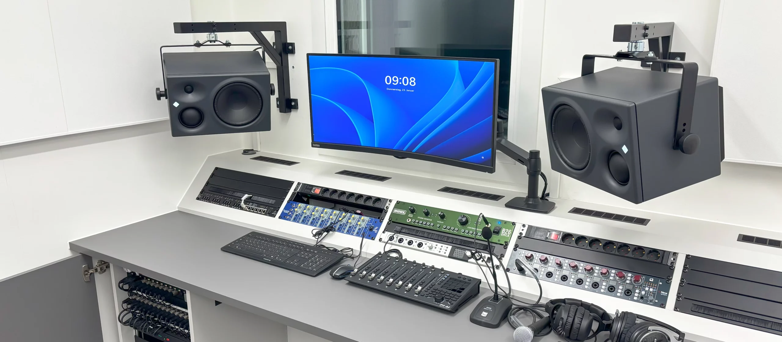 Im Aufnahmestudio erfolgte die Konstruktion und Montage eines flächendeckenden Deckengrids für die Audio-, Video- und Lichttechnik. Das Deckengrid bietet eine stabile Struktur, um Geräte wie Mikrofone, Kameras, Scheinwerfer und andere technische Ausstattungen an der Decke zu montieren.
